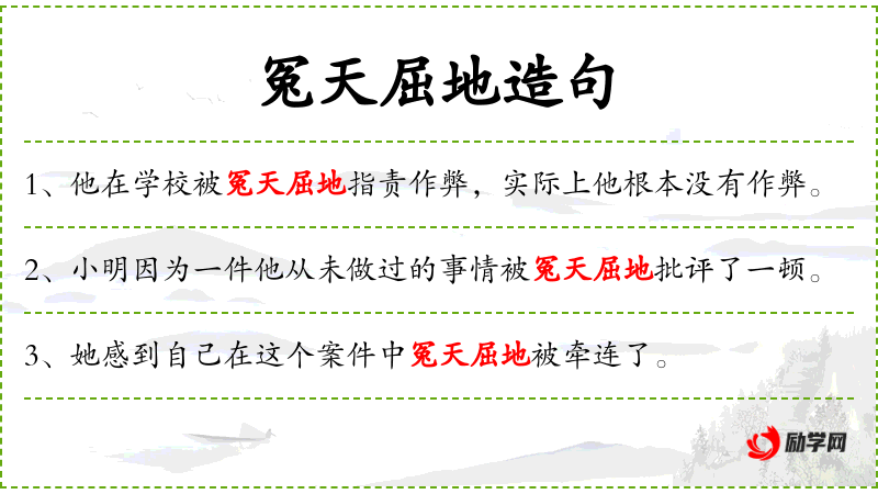 - 被冤天屈地:成语,意思是“被冤枉得非常厉害”。