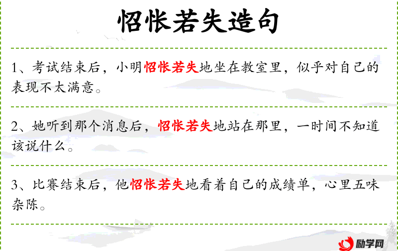 - 怊怅若失地坐在教室里,这种表达方式带有一定的隐含意义,即小明可能因为考试结果不佳而感到失望和沮丧。