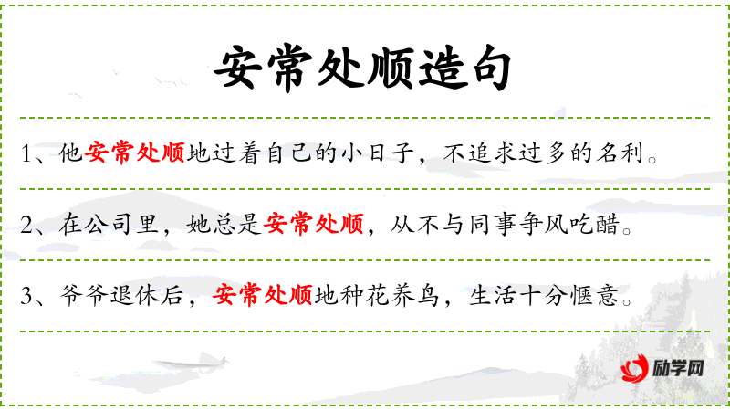 - 成语:安常处顺、不惹是生非,体现了**传统文化中对稳定和和谐的追求。