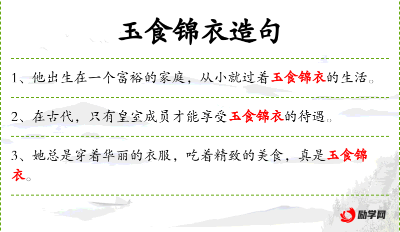 2. 【玉食锦衣】 锦衣:鲜艳华美的衣服;玉食:珍美的食品。精美的衣食。形容豪华奢侈的生活。