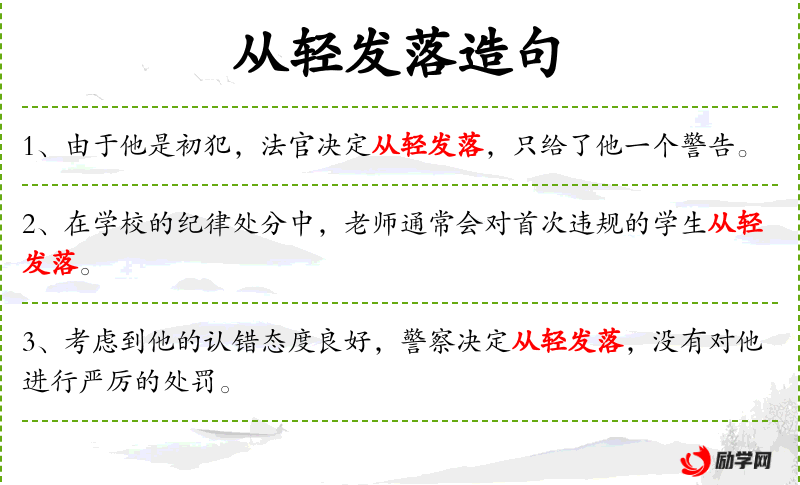 - 从轻发落:指对犯错者给予较轻的处罚。