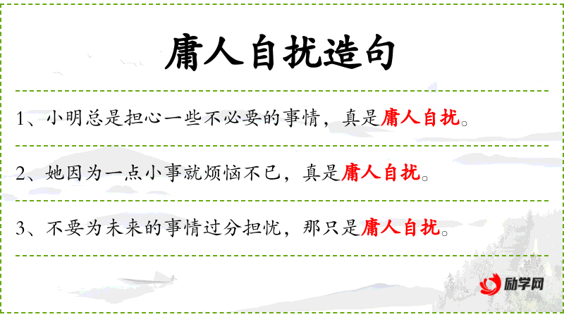 4. 【庸人自扰】 自扰:自找麻烦。指本来没事,自己找麻烦。