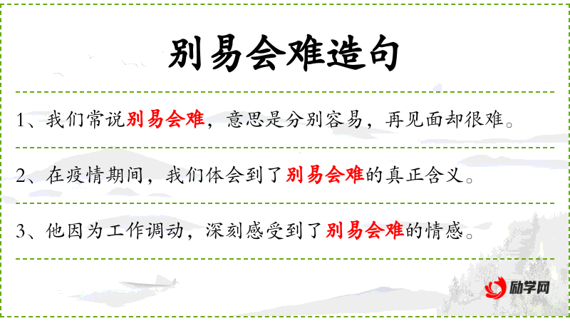 - 别易会难:这个成语反映了文化中对人际关系和离别的重视。在传统文化中,离别往往伴随着深厚的情感和不舍。