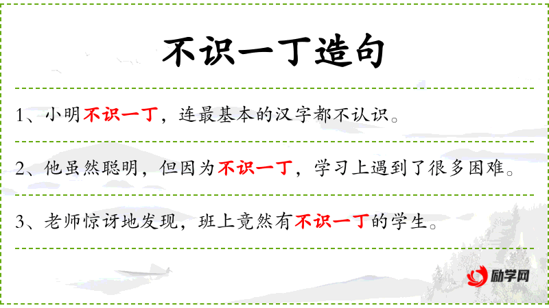 1. 【不识一丁】 - 形容一个字也不认识。