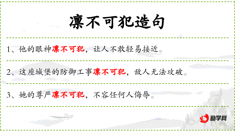 - 凛不可犯:形容词短语,形容气势非常强大,不可侵犯。