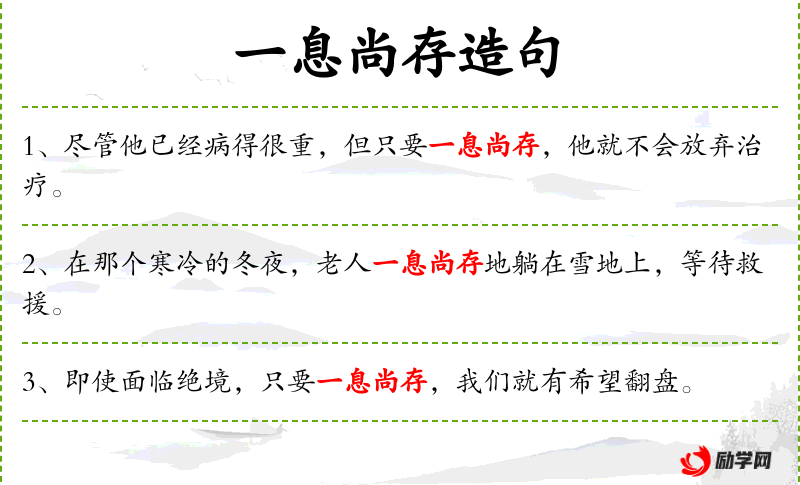 1. 【一息尚存】 - 息:呼吸,气息;尚:还。还有一口气。指生命的最后阶段。