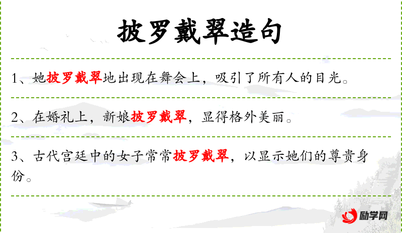 - 披罗戴翠:形容穿着华丽,罗和翠分别指轻软的丝织品和翠绿色的宝石或装饰品。