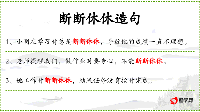- 时断断休休:副词短语,形容工作不连贯,间断性休息。