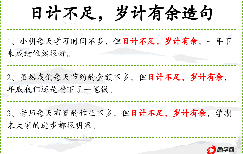 句子:“小明每天学*时间不多,但日计不足,岁计有余,一年下来成绩依然很好。”