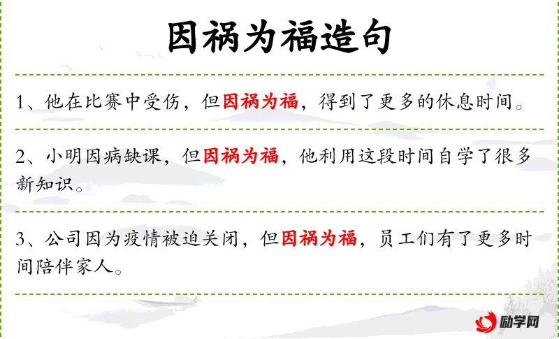 - 因祸为福:成语,表示坏事变成了好事。