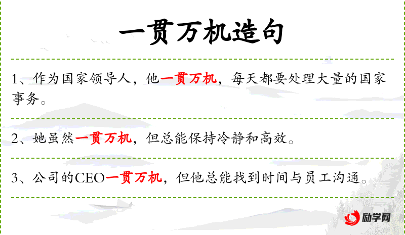 1. 【一贯万机】 - 贯:贯穿。把一种道理贯穿于万事万物之中。