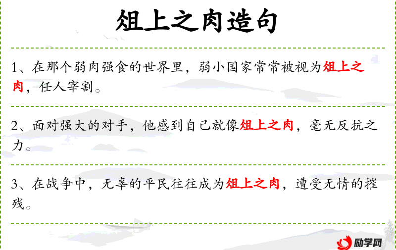 - 俎上之肉:比喻处于任人宰割的境地。