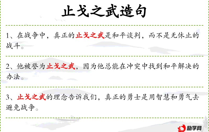 6. 【止戈之武】 意思是“武”字是“止戈”两字合成的,所以要能止战,才是真正的武功。后也指不用武力而使对方屈服,才是真正的武功。