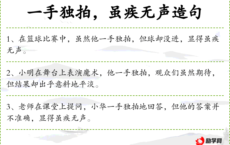 1. 【一手独拍】 - 一只手单独地拍巴掌。比喻一个人或单方面的力量难以办事。
