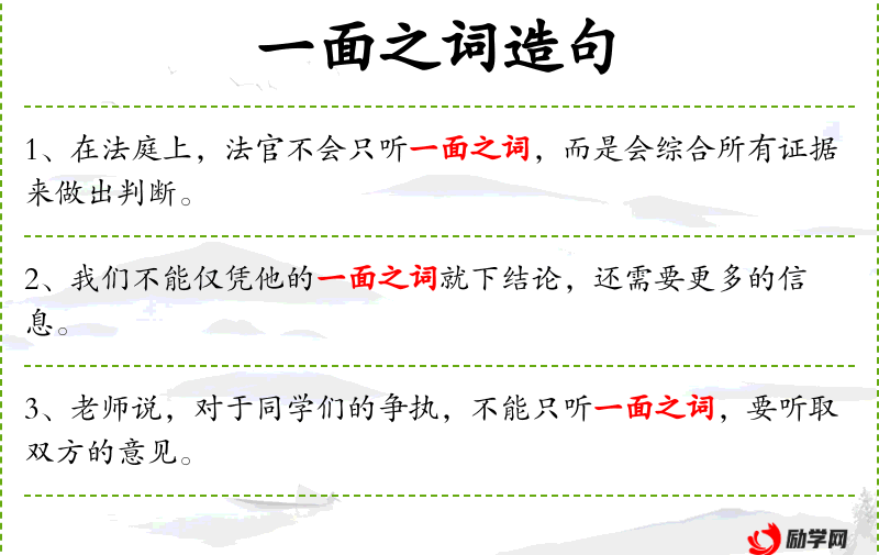 - 一面之词:指单方面的说法,缺乏全面性。