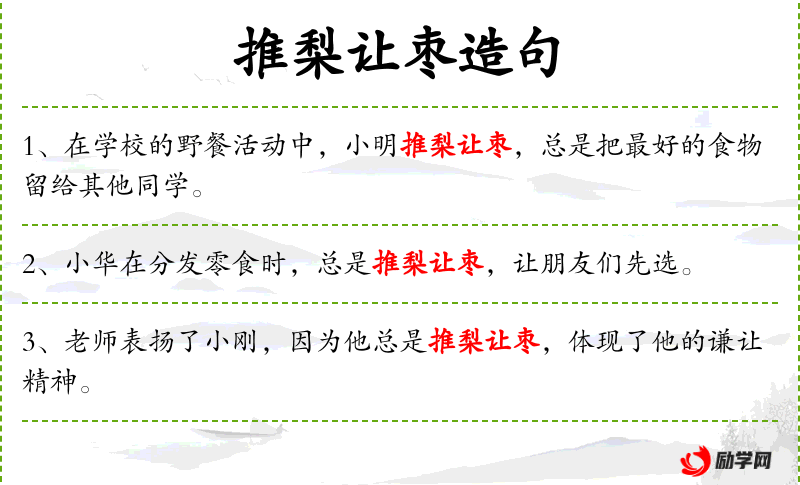 - 成语:推梨让枣,源自《左传·僖公二十五年》,形容谦让的美德。