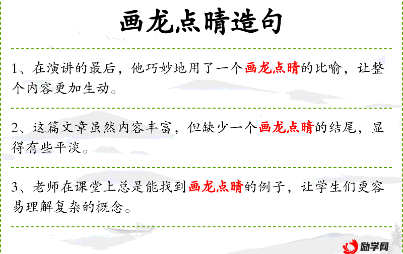 5. 【画龙点晴】 比喻写文章或讲话时,在关键处用几句话点明实质,使内容生动有力。