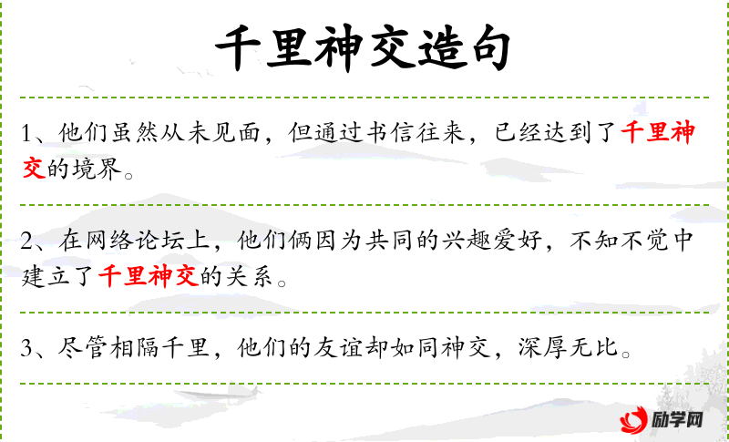 - 千里神交:成语,形容即使相隔千里也能心意相通,精神上互相交流。