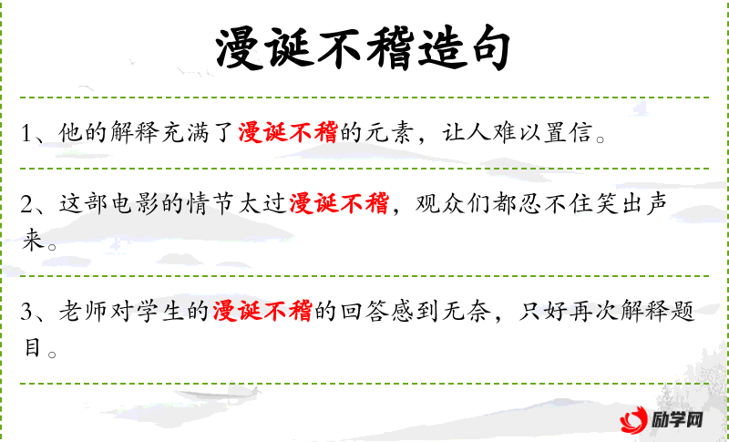 7. 【漫诞不稽】 漫:随意;不稽:没有根据。随便乱说,荒诞不实,没有根据。