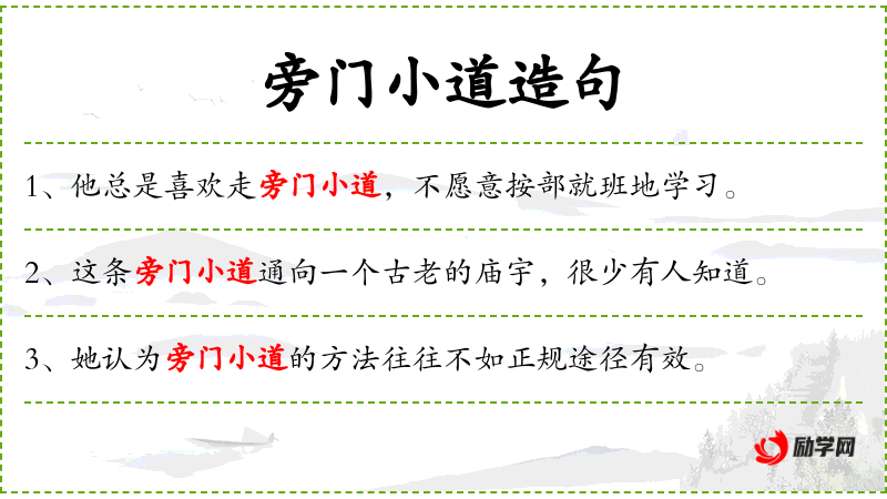 - 宾语:走旁门小道、按部就班地学*