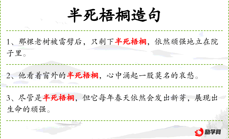句子:“尽管是半死梧桐,但它每年春天依然会发出新芽,展现出生命的顽强。”