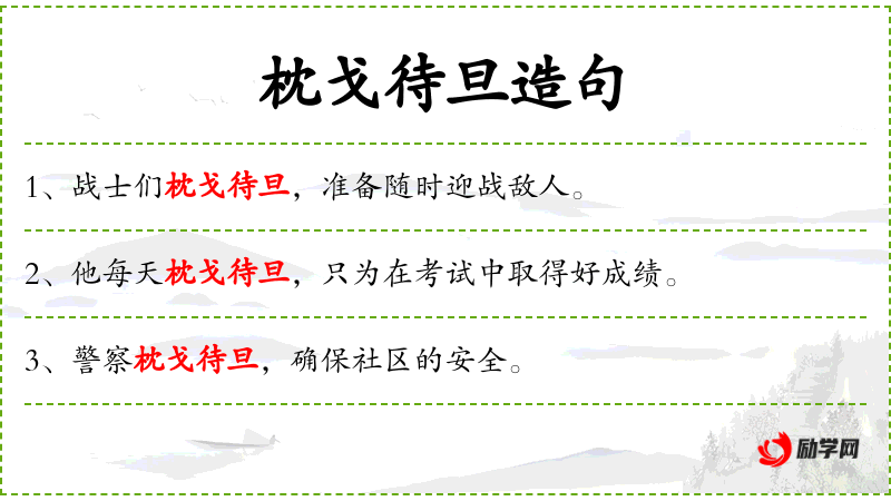3. 【枕戈待旦】 - 戈:古代的一种兵器;旦:早晨。意思是立志杀敌,枕着武器睡觉等天亮。形容时刻准备作战,。