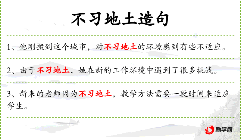 - *不地土:这个成语反映了人对于新环境的适应问题,强调了地理和文化上的陌生感。