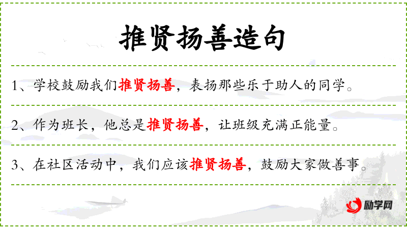 - 推贤扬善:意为推崇贤能,表扬善行。