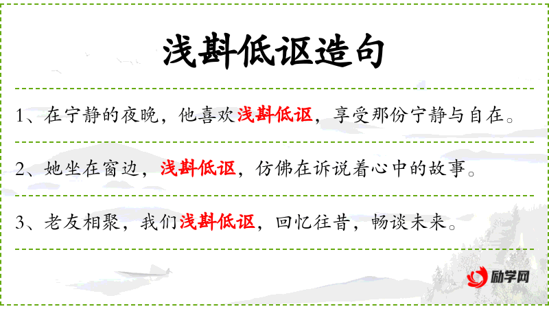 4. 【浅斟低讴】 斟:筛酒;讴:歌唱。斟着茶酒,低声歌唱。形容悠然自得、遣兴消闲的样子。