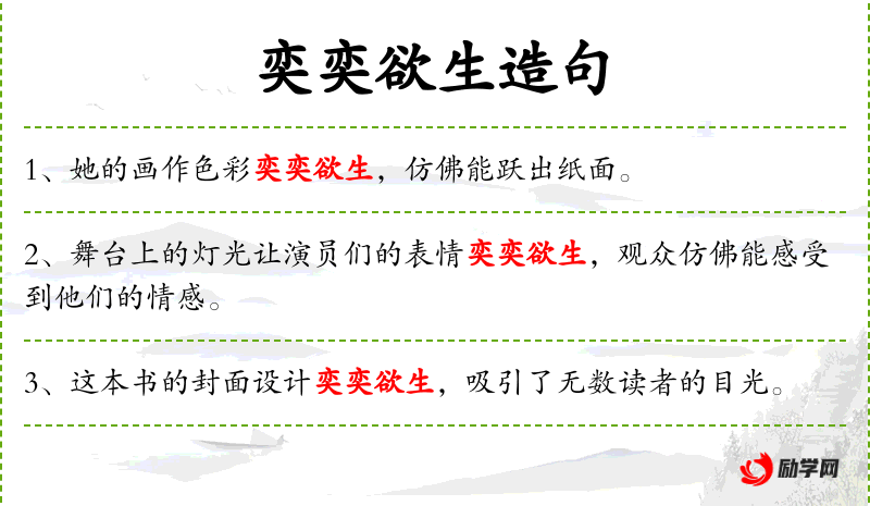 - 奕奕欲生:形容光彩夺目,生动逼真。