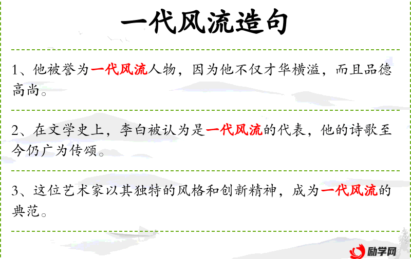 - 一代风流:形容某人在某一时代以其才华或风度著称。