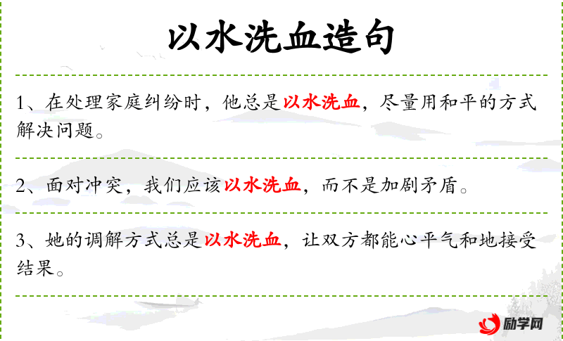 - 宾语:“以水洗血,而不是加剧矛盾”