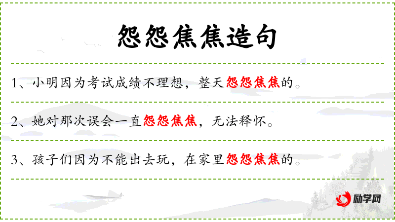 - 怨怨焦焦:形容词,形容心情烦躁、不满。
