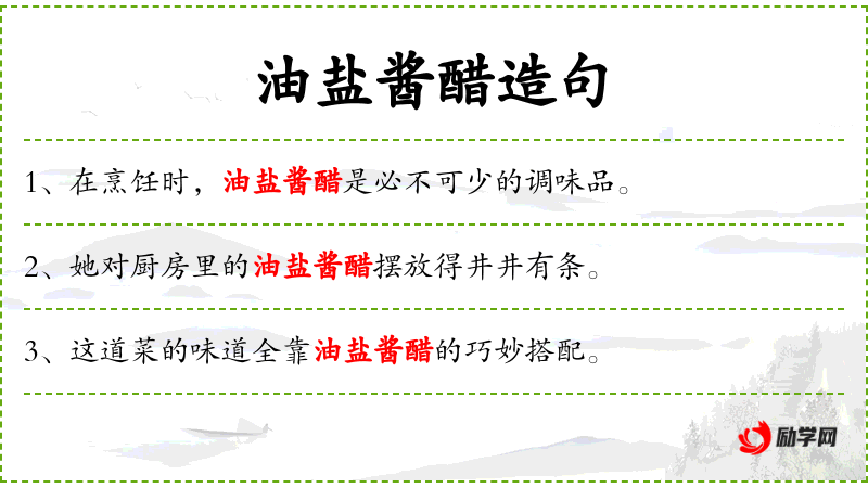 1. 【油盐酱醋】 - ①泛指烹调佐料。比喻另外添加的原来没有的内容。②指琐碎庸俗。