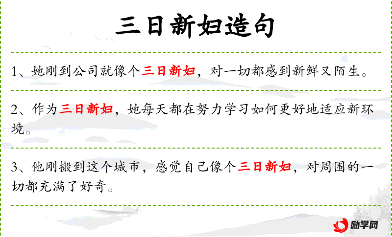 1. 【三日新妇】 旧时过门三日之新妇,举止不得自专。因以喻行动备受拘束者。