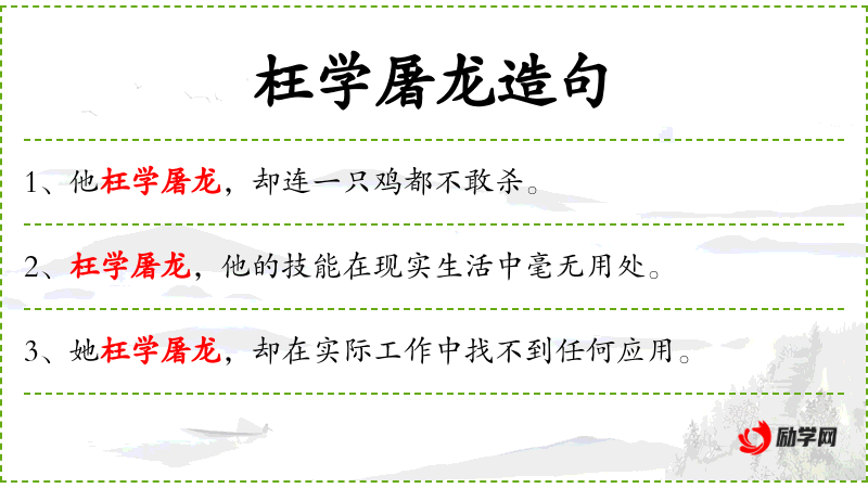 枉:徒然,白白地;屠:杀。白白学习了杀龙的技术。比喻徒然学习毫无实用价值的技术。