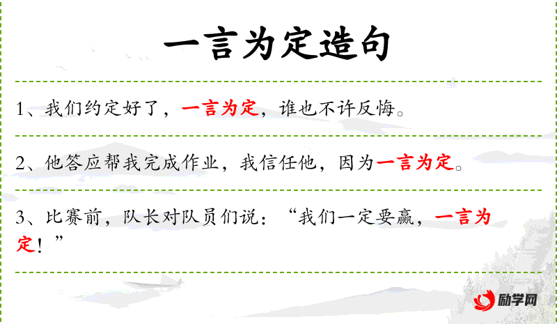 1. 【一言为定】 - 一句话说定了,不再更改。比喻说话算数,决不翻悔。