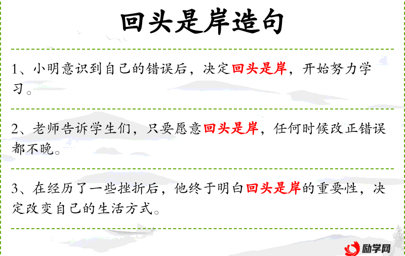 - 日文:使用“岸に戻る”来表达“回头是岸”,同样保留了比喻意义。