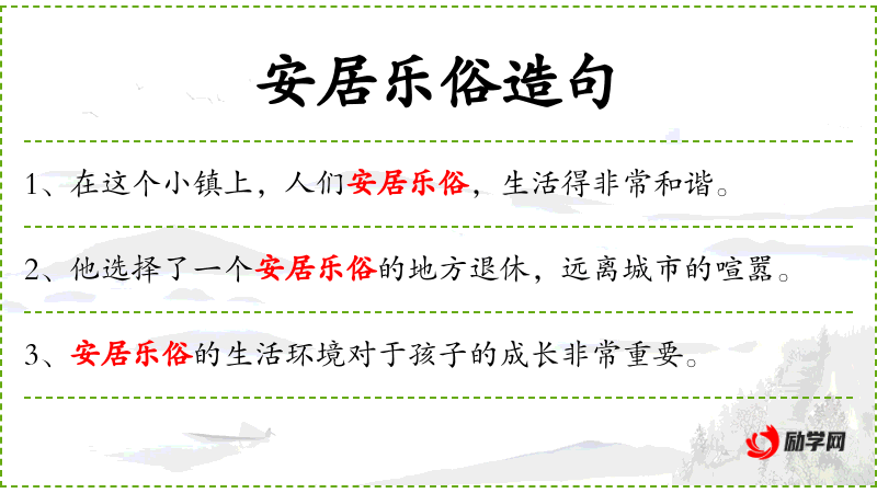 - 安居乐俗:形容词短语,形容一个地方生活安定、*俗和谐。