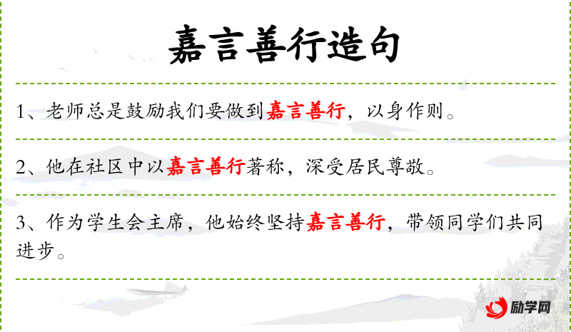 3. 【嘉言善行】 嘉:善、美。有教育意义的好言语和好行为。