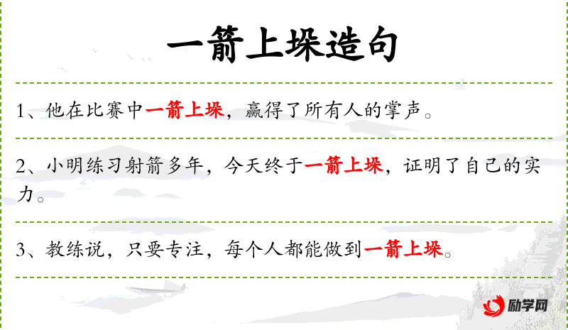 - 原句:在射箭比赛中,他稳定心态,最终一箭上垛,夺得冠军。