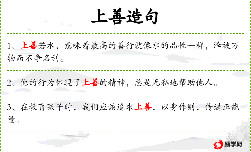 2. 【上善若水】 - 上善:至善,最完美;水:这里喻指与世无争的圣人。达到尽善尽美的境界,就和圣人差不多了。