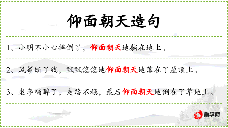 - 成语:“仰面朝天”是一个常用的成语,描述人躺下的姿势。