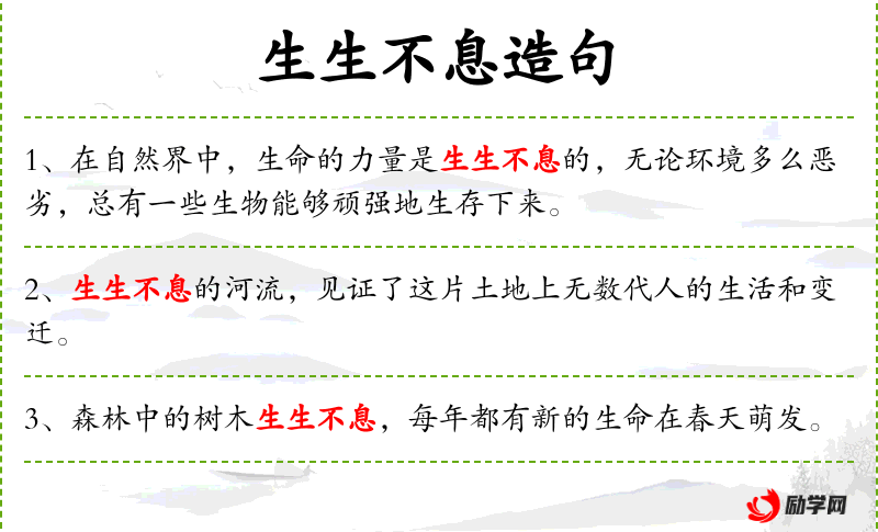 4. 【生生不息】 - 生生:中国哲学术语,指变化和新生事物的发生;不已:没有终止。不断地生长、繁殖。