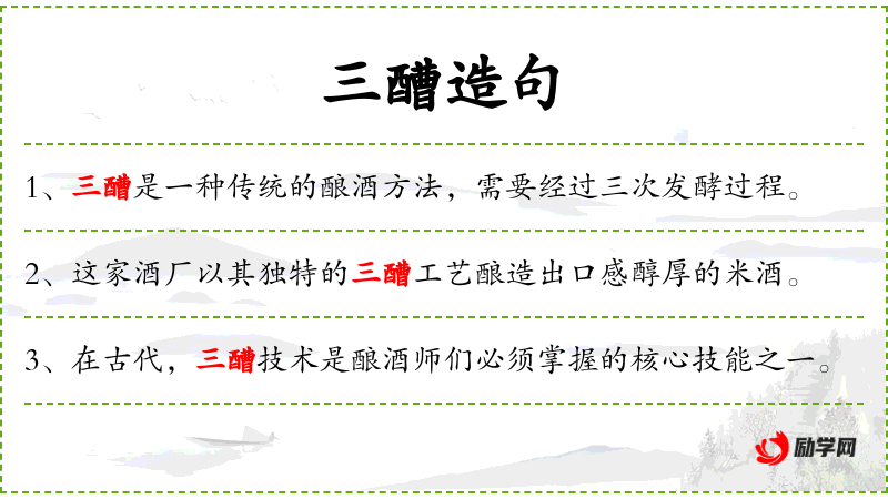 6. 【酿造】 - 用发酵的方法制造泉水酿造的酒味特别醇。