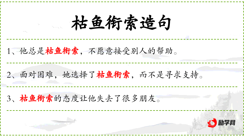 2. 【枯鱼衔索】 - 衔:含;索:绳子。穿在绳上的干鱼。形容事物存在的日子已经不多。