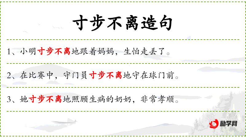 1. 【寸步不离】 寸步:形容距离很近。原指夫妻和睦,一步也不离开。现在泛指两人感情好,总在一起。