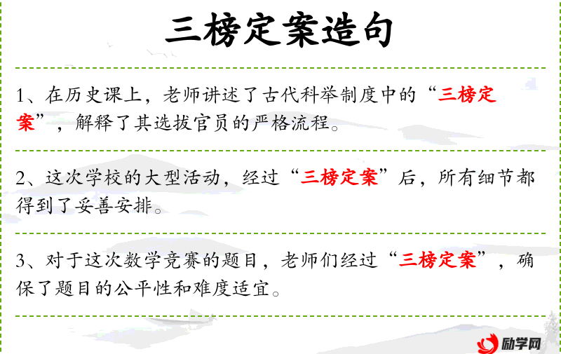 1. 【三榜定案】 三次张榜,广求意见,再作最后决定。极言行事慎重。