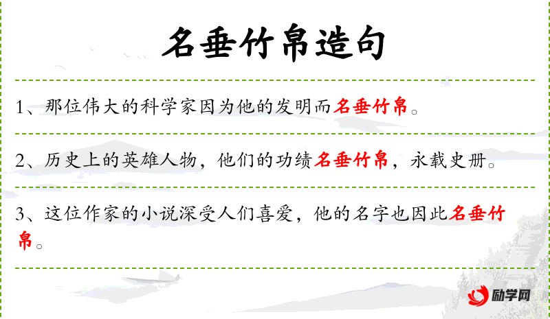 1. 【名垂竹帛】 比喻好名声永远流传。
