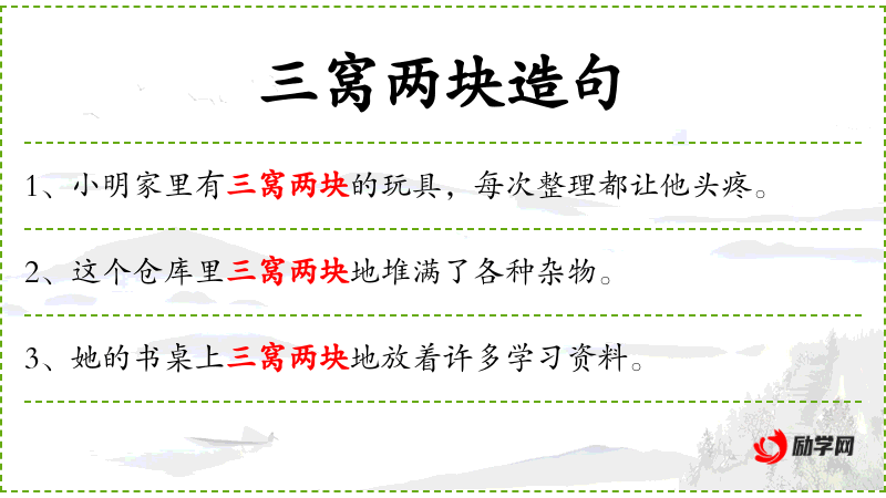 - 三窝两块地:形容词短语,形容堆放的方式杂乱无章。